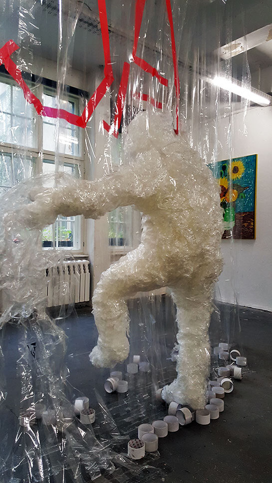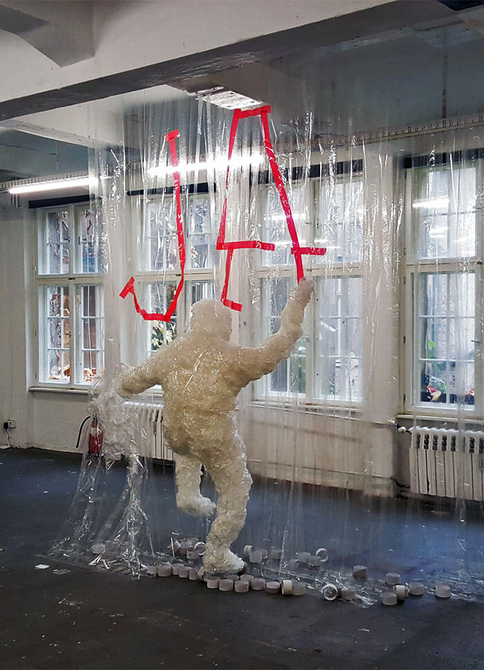 Zu der Tape Art Convention 2016 haben wir uns überlegt ein Kunstwerk zu kreieren, das man noch nicht zuvor gesehen hat. Als Ergebnis, stand vor uns eine dreidimensionale Darstellung eines Mannes in voller Lebensgröße. Die Skulptur besteht aus nur transparentem Klebeband. Schon beim Kleben bekam der Mann einen Namen. Ab sofort alle nannten ihn Detlef. Somit war erstmal „Detlef der Tape-Künstler“ geboren.